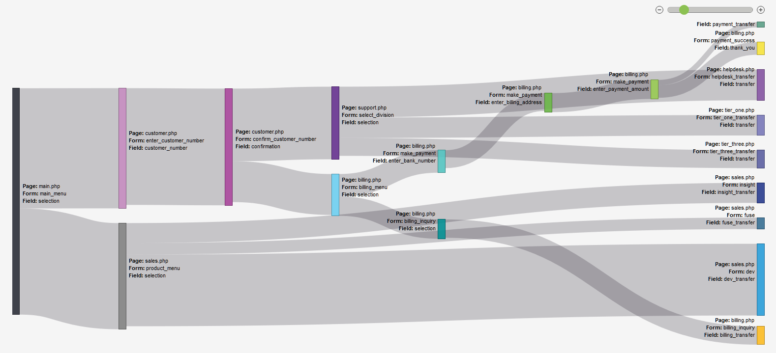 Read the common call path diagram from left to right. Each node of the graph represents a form in your application and the connections between the nodes represent the different paths callers follow when using the application. The size of the nodes and connections between them correspond to the actual number of users who followed that path. This provides, at a glance, a sense of scale in relation to how callers use the application and how frequently callers reach a specific node from the previous node. More frequently visited nodes are larger than less frequently visited nodes.